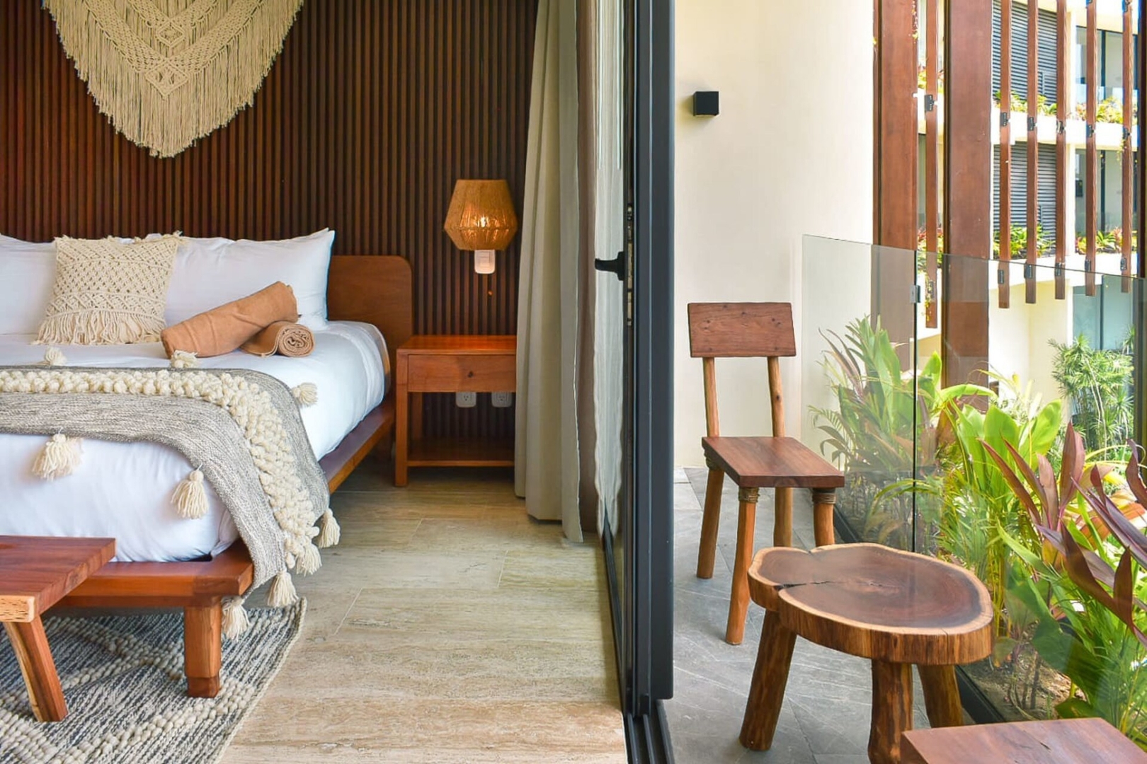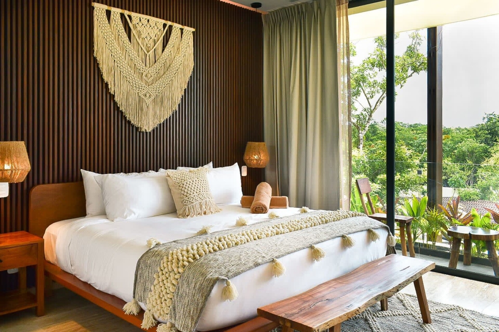 This retreat is the perfect nest for your Tulum getaway. As you step inside, you'll find a compact yet fully equipped kitchen with a stove, mini fridge, microwave and all the utensils you need to cook. Adjacent to the kitchen is the dining area eqquiped for two guests, alongside a king-size bed, smart TV, and a beautiful mirror, creating the perfect ambiance for your vacation. Floor-to-ceiling windows flood the space with natural light and offer stunning views of the pool and gardens. Step out onto the private balcony, your perfect spot to relax and enjoy Tulum's natural climate.