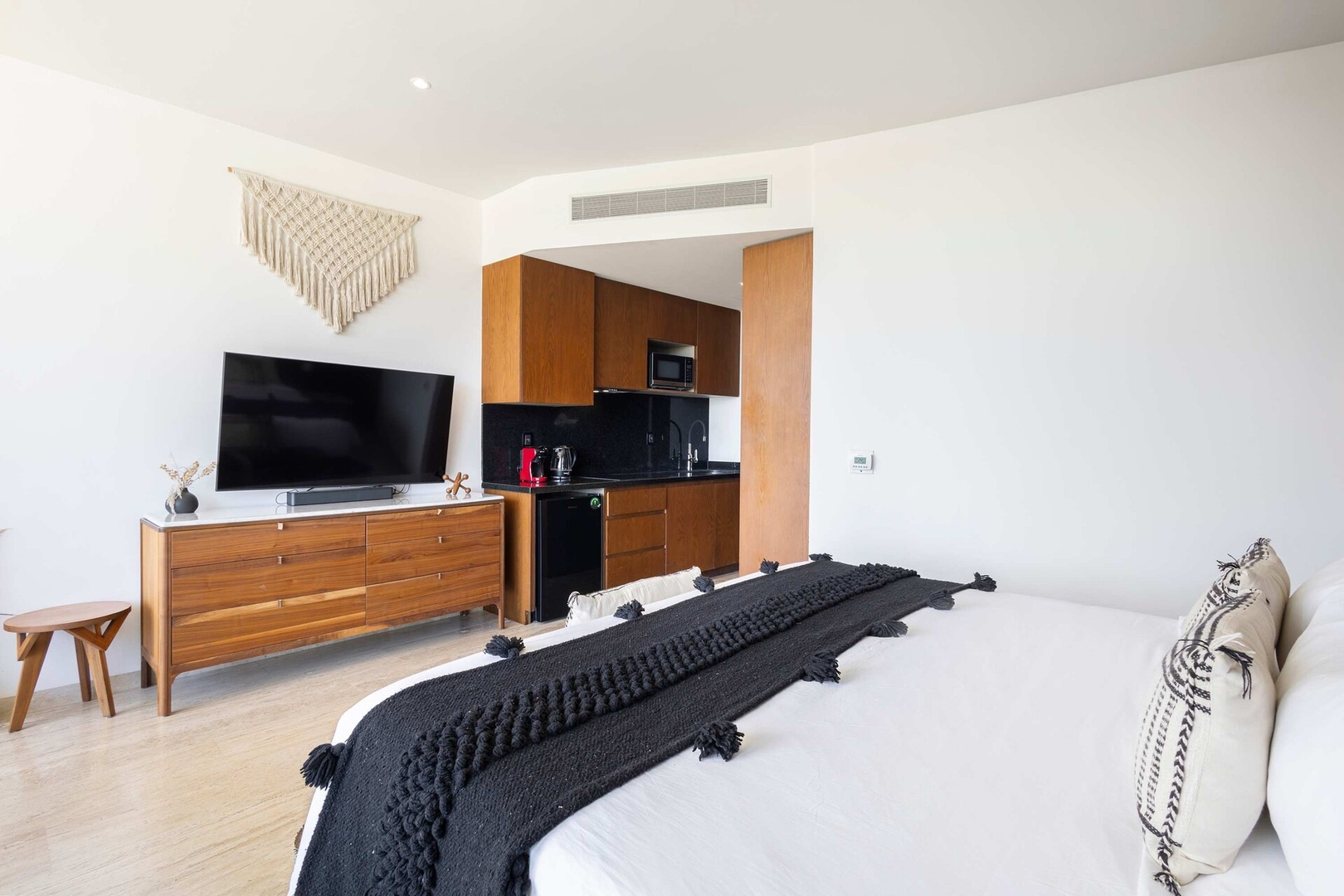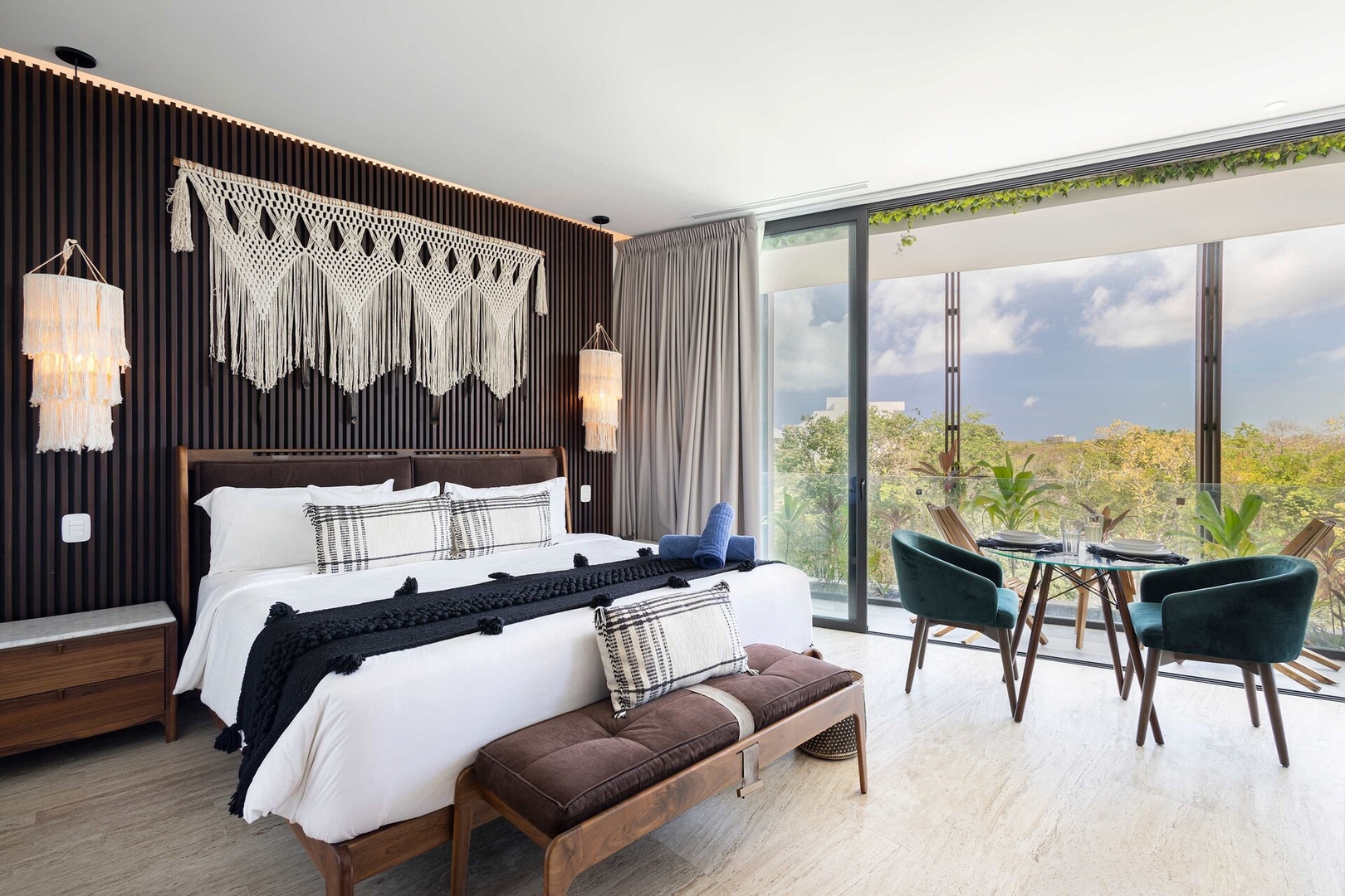 Stay at this astounding studio with one king-size bed. This brand new luxury apartment with boho decor allows you to live an authentic Tulum experience. The unit offers dining with breathtaking views, kitchenette, wardrobe & bathroom with modern finishes & hair dryer. The private living terrace captures the calming essence of the Tulum, and provides a secret garden for unwinding with nature.